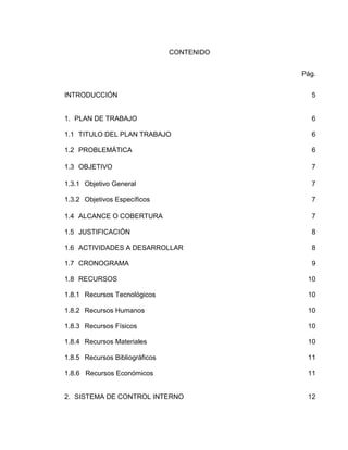 El documento presenta un informe sobre la implementación de un sistema de control interno en el área de inventarios de la empresa Surtimat Ltda., basado en la metodología C.O.S.O. Se busca optimizar el control de inventarios, mejorar la toma de decisiones y aumentar la competitividad de la empresa. A través de un diagnóstico y la propuesta de soluciones prácticas, se pretende abordar las problemáticas de control interno identificadas en la organización.