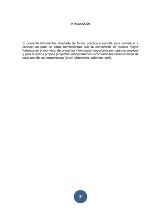 Este documento presenta tutoriales para usar cuatro herramientas TIC: Prezi, Calameo, SlideShare y Voki. Explica los pasos para crear cuentas gratuitas en cada sitio y luego crear y publicar presentaciones, documentos, diapositivas y avatares de voz respectivamente en los sitios y en blogs. El objetivo es comenzar a conocer estas herramientas que serán útiles para presentar información.