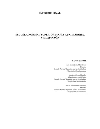 Este documento presenta el informe final de la Escuela Normal Superior María Auxiliadora en Villapinzón sobre la educación inclusiva. Describe la caracterización de la población con discapacidad en la región desde 1994 y los esfuerzos por incluirlos en la institución desde 2002. Explica que desde 2010 se han matriculado dos estudiantes con discapacidad en el aula regular mientras que el resto continúa asistiendo al centro de día financiado por el municipio. Finalmente, señala que desde 2002 los estudiantes de formación de maest