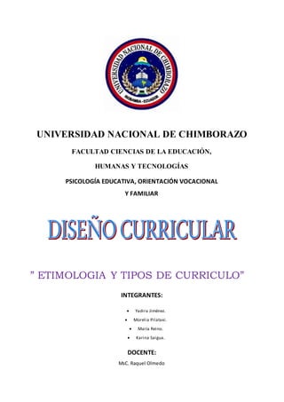El documento presenta información sobre el concepto de currículo, su etimología y tipos. Explica que currículo proviene del latín y significa "carrera". Define currículo como el conjunto de objetivos, contenidos y criterios de enseñanza y evaluación de un nivel educativo. Identifica cinco tipos de currículo: formal, real, oculto, nulo y extracurricular. El grupo concluyó que cada tipo trabaja con una metodología diferente tras investigar sobre el tema.