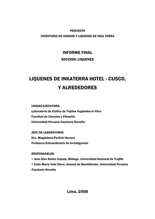 El estudio presenta un inventario de líquenes en las inmediaciones del Inka Terra Hotel en Machu Picchu, Perú. Se identificaron 92 morfotipos pertenecientes a 50 especies diferentes de líquenes agrupados en 26 géneros y 17 familias. Los líquenes más abundantes fueron los foliosos y crustosos. El área de estudio comprende 10 hectáreas de bosque secundario donde se establecieron transectos de muestreo. Adicionalmente se realizaron colectas en otras zonas cercanas.