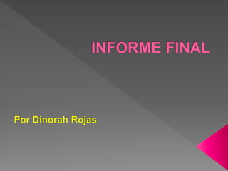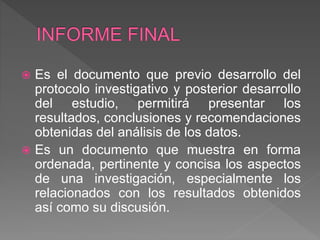 Este documento proporciona las pautas para la elaboración de un informe de investigación. Explica que el informe final debe presentar los resultados, conclusiones y recomendaciones de un estudio de manera ordenada, concisa y pertinente. Detalla los componentes esenciales de un informe como la introducción, objetivos, metodología, resultados, discusión, conclusiones y referencias. Además, enfatiza la importancia de ajustar el informe a su propósito y audiencia.