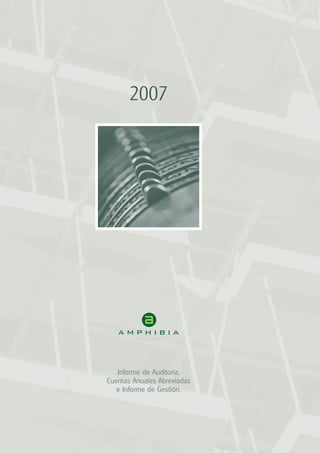Este documento presenta los estados financieros resumidos de Amphibia Management S.L. para el ejercicio 2007, incluyendo el balance de situación, la cuenta de pérdidas y ganancias, y notas explicativas. El balance muestra un activo total de 9.8 millones de euros y fondos propios de 9.5 millones de euros. La cuenta de pérdidas y ganancias muestra un beneficio de 14,685 euros. Adicionalmente, la memoria abreviada describe la naturaleza y actividades principales de la compañía.