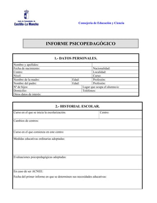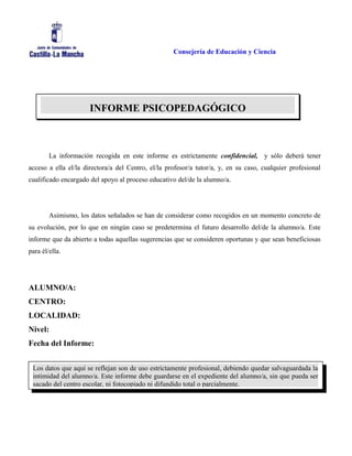 Este informe psicopedagógico evalúa a un alumno de primaria para determinar sus necesidades educativas. La información recogida es confidencial y sólo puede ser accesible por el director, tutor y profesionales. El informe incluye datos personales del alumno, su historial escolar, desarrollo general, estilo de aprendizaje, aspectos del proceso de enseñanza-aprendizaje, influencia familiar y propuesta de medidas educativas.