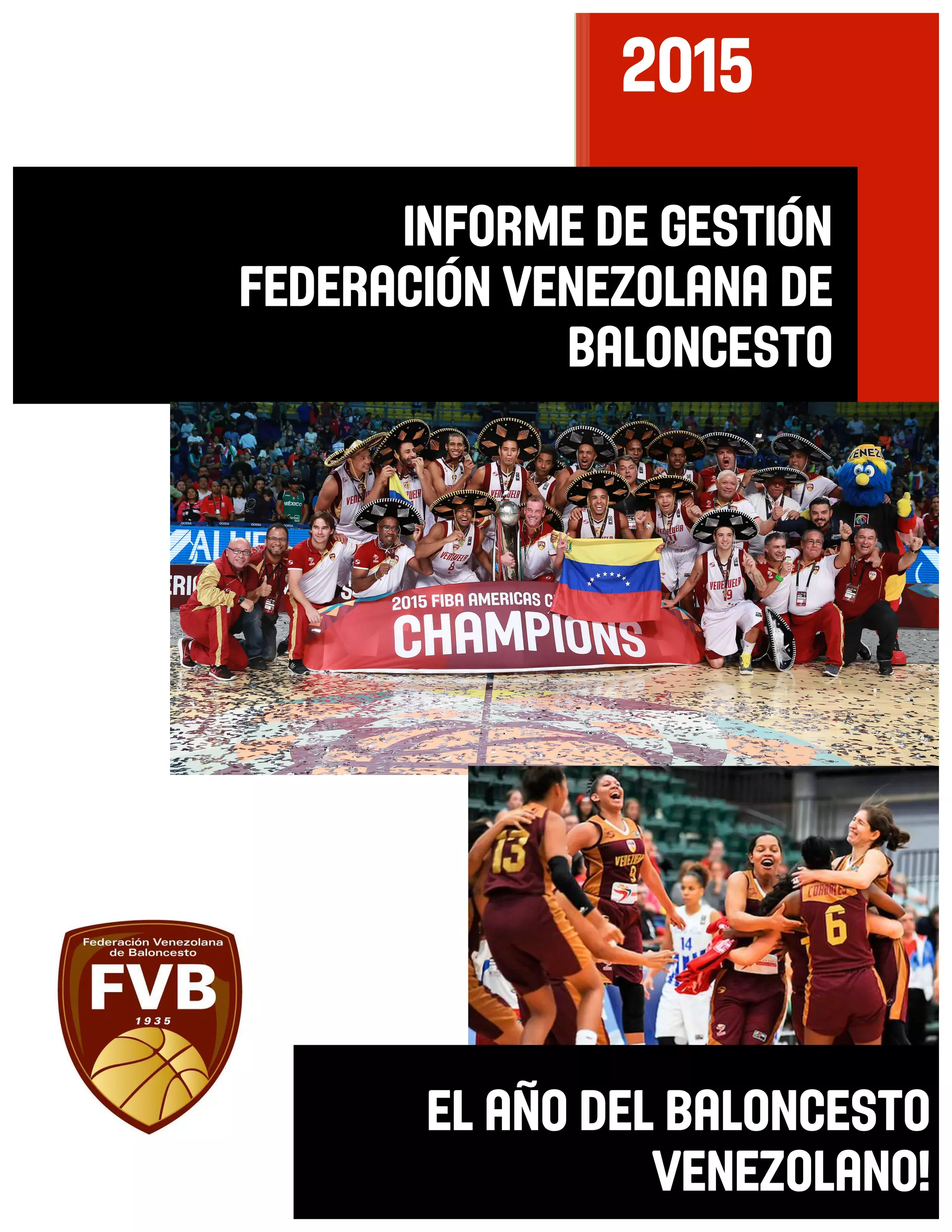 El documento resume los eventos y logros del baloncesto venezolano en 2015, incluyendo la clasificación histórica de la selección masculina a los Juegos Olímpicos de Río y los subcampeonatos de las selecciones femeninas sub-14 y sub-17 en los campeonatos sudamericanos. También describe los campeonatos nacionales celebrados a nivel sub-12 y sub-15 en Venezuela durante el año.