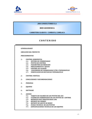 Este documento describe los procedimientos para establecer una red geodésica utilizando GPS diferencial para el proyecto de mejoramiento de la carretera Ilabaya-Cambaya en Camilaca, Perú. Se utilizaron 3 puntos de control del Instituto Geográfico Nacional y se establecieron 2 puntos base y 14 puntos de control a lo largo de la carretera. Los datos fueron procesados y ajustados mediante el método de mínimos cuadrados para determinar las coordenadas UTM y geográficas de los puntos.