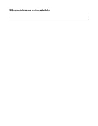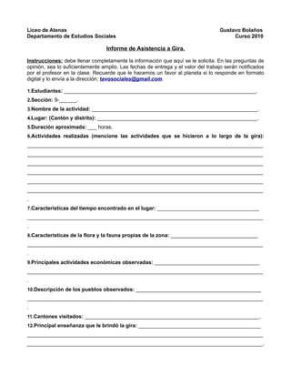 El documento es un informe de asistencia a una gira escolar que incluye instrucciones para llenar la información solicitada sobre la gira, como los estudiantes que asistieron, la sección, el nombre y lugar de la actividad, la duración, las actividades realizadas, las características del tiempo y flora/fauna de la zona, las actividades económicas observadas, la descripción de los pueblos visitados, los cantones visitados, las enseñanzas y recomendaciones.