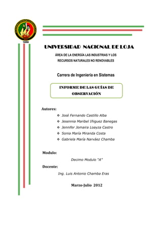 El resumen describe tres actividades realizadas como parte de guías de observación por estudiantes de ingeniería en sistemas de la Universidad Nacional de Loja. La primera fue una visita a la Asamblea Nacional donde observaron el sistema de voto electrónico. La segunda fue una visita a la empresa de desarrollo de software Kruger para conocer sus procesos y proyectos. La tercera fue una visita a la Cervecería Nacional para conocer su producción. El objetivo general de las guías fue contrastar la teoría con la práctica y despejar inqu
