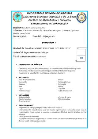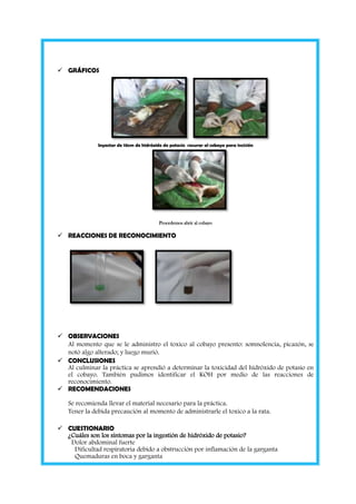 Este documento resume una práctica de laboratorio realizada por estudiantes de bioquímica y farmacia sobre la intoxicación por hidróxido de potasio (KOH) en cobayos. Los objetivos fueron observar la reacción del cobayo ante la administración de KOH, identificar el KOH mediante pruebas de reconocimiento y determinar la toxicidad del KOH. Se administró KOH a un cobayo por vía parenteral, luego de lo cual murió. Sus vísceras fueron analizadas y mediante pruebas se identificó