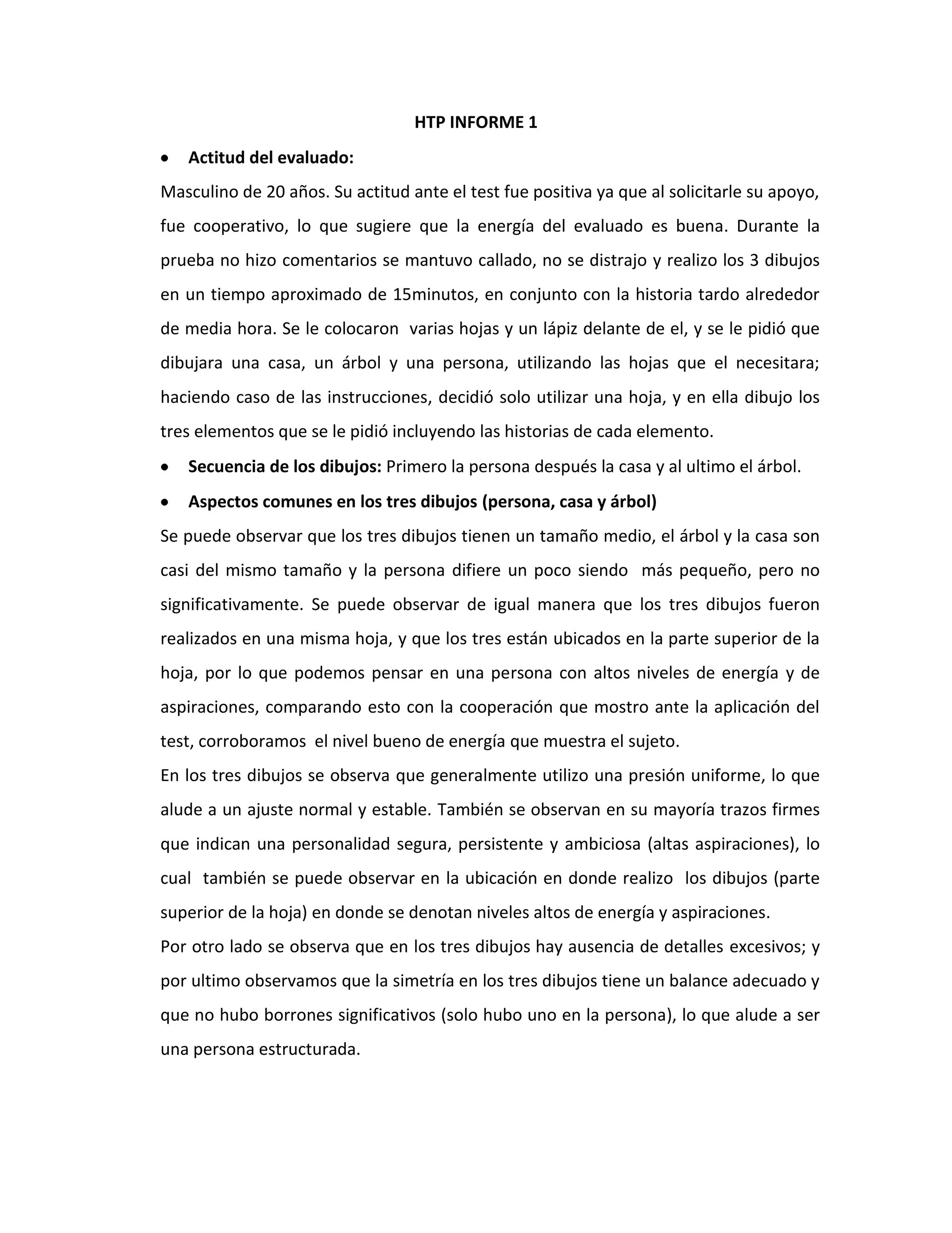 Este documento presenta el resumen de un informe psicológico basado en el Test de los Tres Dibujos. El evaluado, un hombre de 20 años, completó los dibujos de una persona, casa y árbol de manera cooperativa. Los dibujos sugieren altos niveles de energía y aspiraciones, pero también sentimientos de inadecuación social e introversión. El análisis detallado de cada dibujo revela omisiones que indican miedo a la castración, sentimientos de inferioridad, tendencias hostiles y deseo