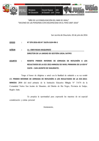 Este documento resume una jornada de reflexión sobre los resultados de una evaluación educativa en una escuela primaria en Perú. La jornada involucró a estudiantes, padres, maestros y autoridades locales para identificar las debilidades en el aprendizaje y proponer soluciones. Se discutieron los logros y dificultades, y todos los grupos se comprometieron a mejorar el rendimiento académico de los estudiantes.