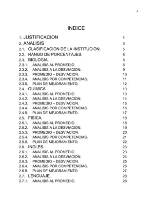 Este documento presenta un análisis detallado de los resultados de las pruebas Saber 11 del Instituto Integrado Francisco Serrano Muñoz de Girón en 2012. Incluye información sobre el rendimiento de la institución en cada materia en comparación con los promedios nacionales, departamentales y municipales, así como planes de mejora basados en los resultados.