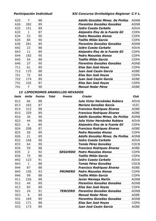 Este documento presenta los resultados de la participación individual en el 12o Concurso Ornitológico Regional. Se muestran los puntajes obtenidos por las aves de diferentes criadores agrupadas por categoría de plumaje. El ganador en la categoría de Lipócromos Rojos Nevados fue José Luis Lara Sacristán. En Lipócromos Amarillos Intensos ganó Tomás Pérez González. Pedro Mazuelas Alonso obtuvo el primer lugar en Lipócromos Amarillos Nevados.