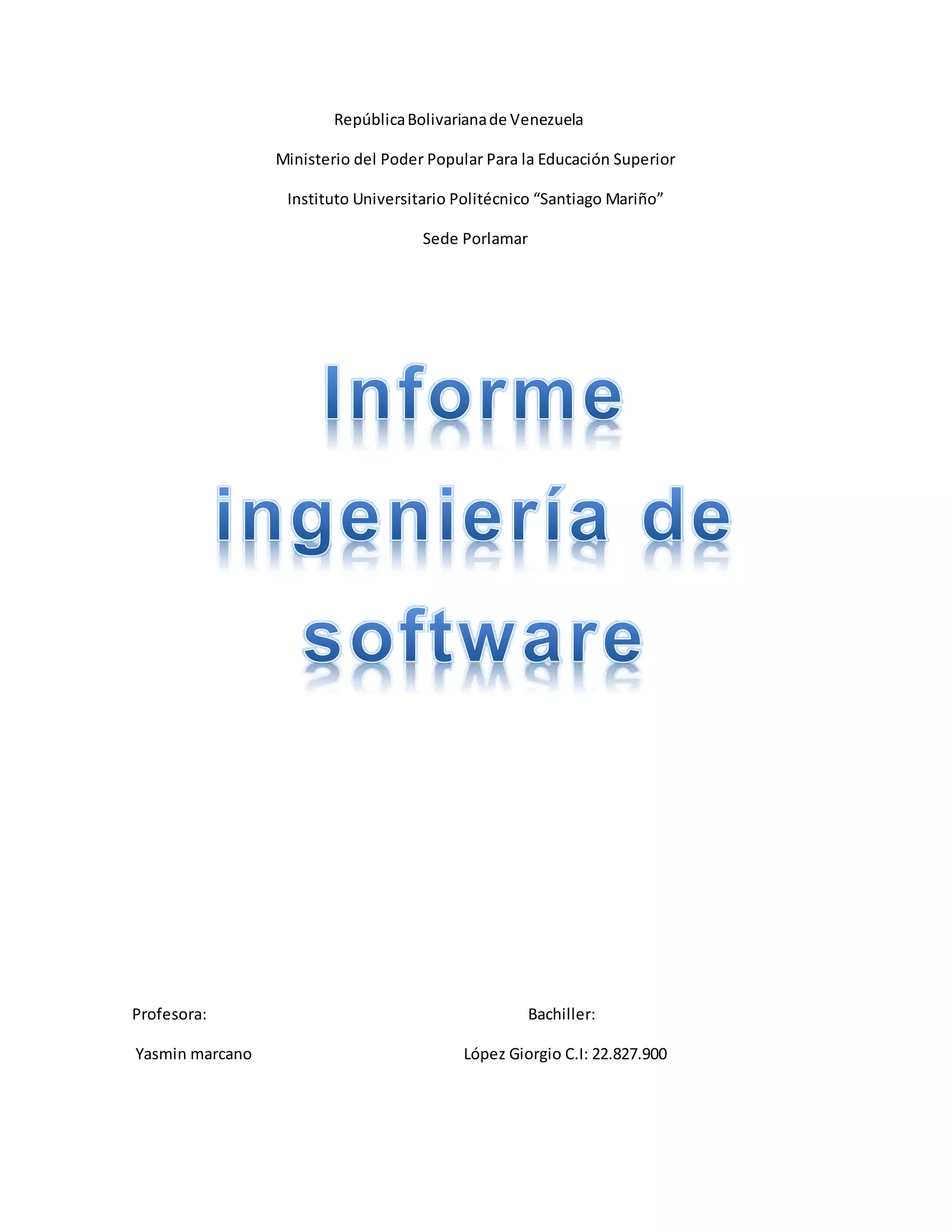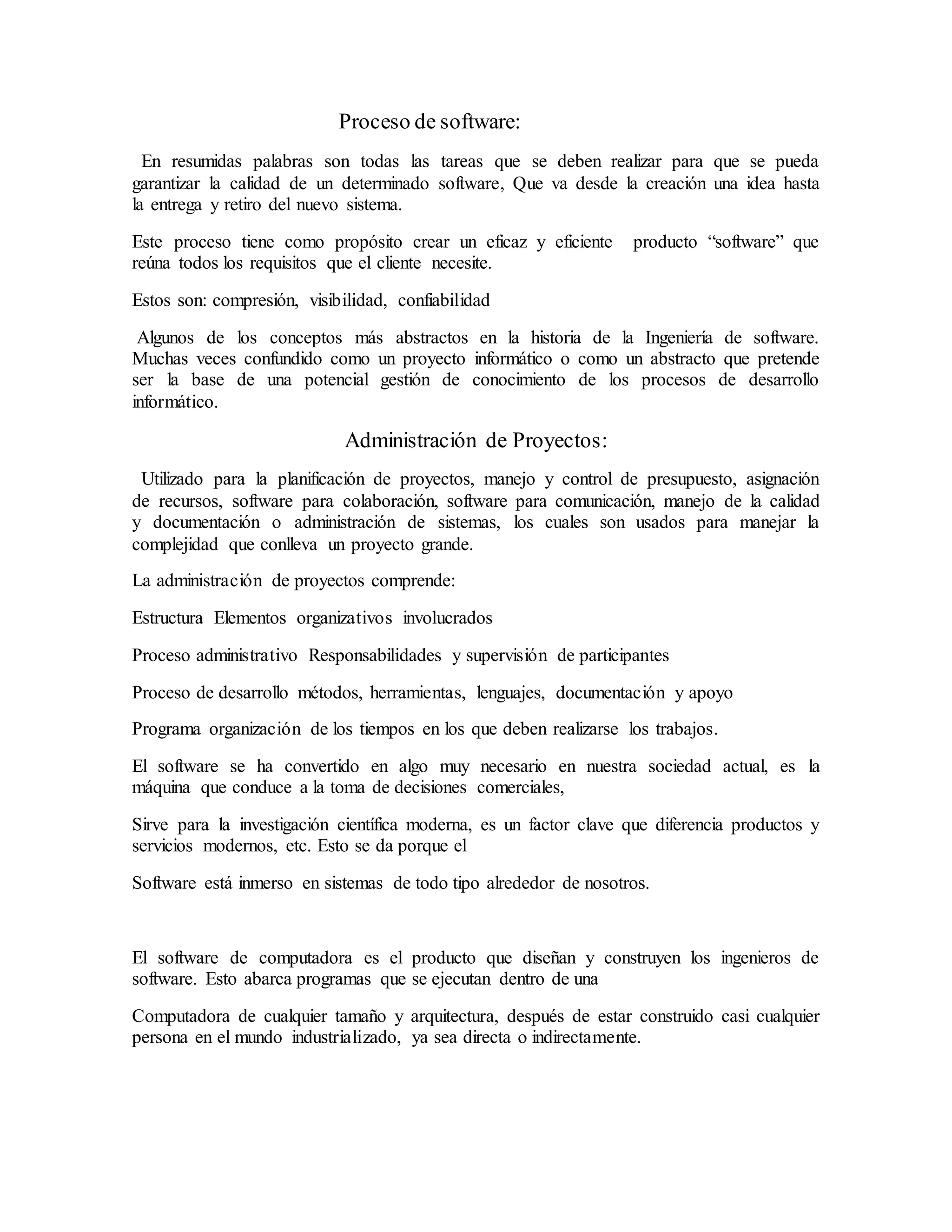 El proceso de software incluye todas las tareas necesarias para garantizar la calidad de un software, desde la creación de una idea hasta la entrega y retiro del sistema. La administración de proyectos se utiliza para planificar, manejar y controlar los recursos y presupuesto de un proyecto. Existen diferentes tipos de productos de software como los genéricos para la venta al mercado y los hechos a medida para un cliente específico.