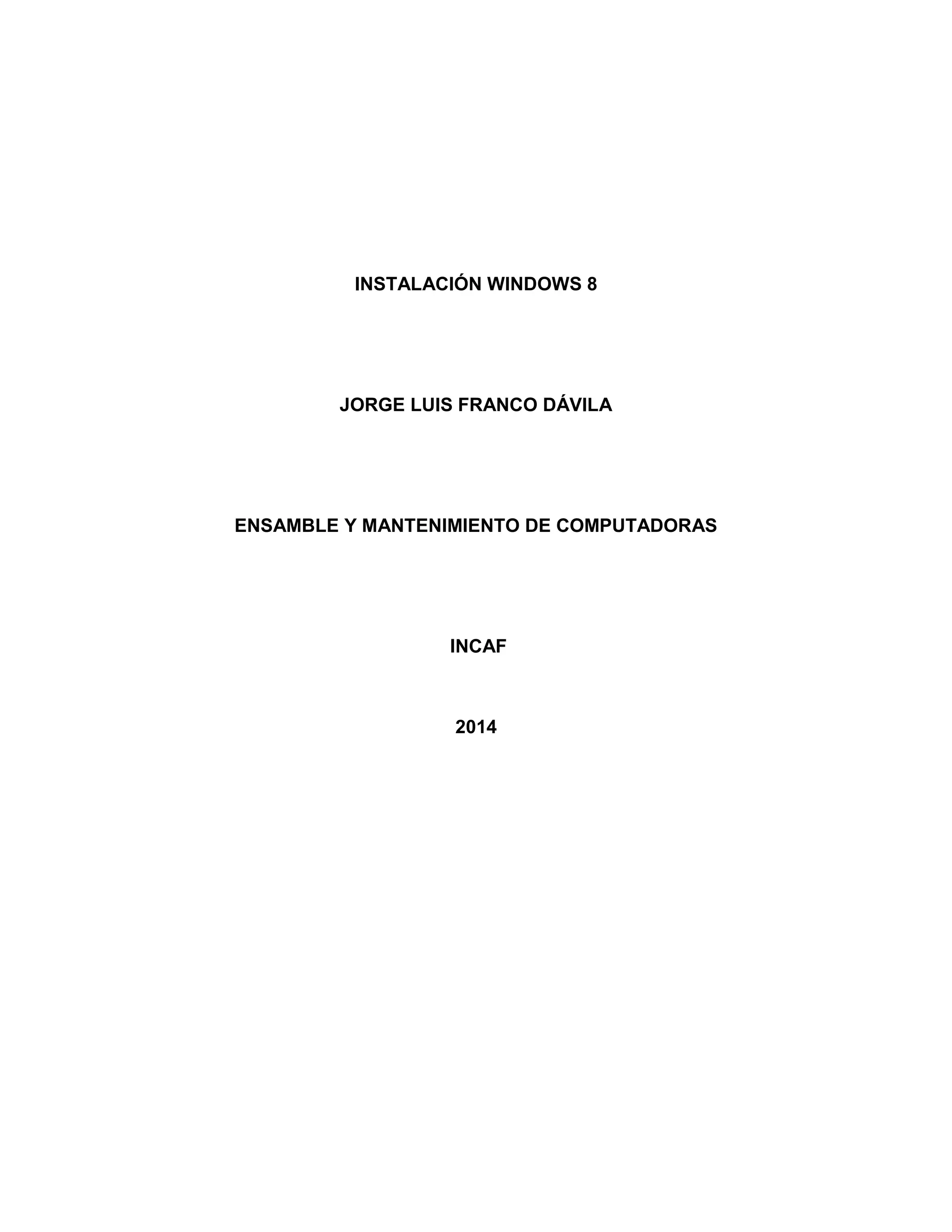 Este documento describe los pasos para instalar Windows 8 en una computadora, incluyendo la configuración de la BIOS, preparación del sistema operativo, proceso de instalación, e instalación de programas adicionales. Explica cada etapa del proceso de instalación, desde seleccionar el idioma y formato hasta personalizar la configuración, crear una cuenta y completar la configuración inicial del sistema operativo.