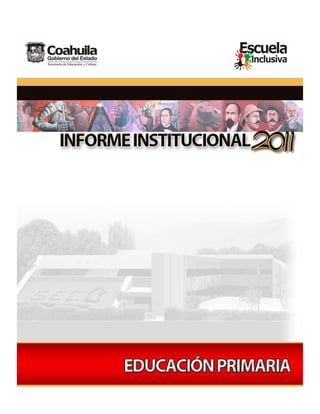 El documento presenta el informe institucional de educación primaria. Describe las políticas y leyes que rigen la educación primaria en Coahuila, incluyendo la Constitución Mexicana, la Ley General de Educación y la Ley Estatal de Educación. Explica los objetivos de la educación primaria y los procesos educativos implementados como la aplicación de políticas, evaluaciones, seguimiento académico y gestión escolar. El informe analiza los resultados obtenidos en relación a estos procesos durante el periodo de 2010 a