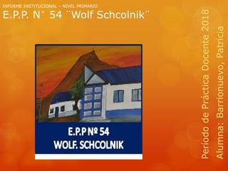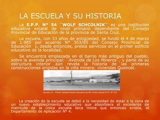 La Escuela N° 54 es la escuela primaria más antigua de la localidad de Río Turbio, con 33 años de historia. Actualmente cuenta con 156 estudiantes y ofrece educación en tres turnos. Además de las aulas de clase, la escuela tiene una biblioteca, laboratorio, sala de música y sala de informática. El informe analiza las fortalezas y debilidades de la escuela, asi como los proyectos educativos implementados como el fortalecimiento de trayectorias escolares. Finalmente, presenta el grupo de 7mo grado B asignado
