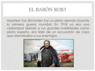 Manfred Von Richtofen, conocido como el Barón Rojo, fue un as de la aviación alemana durante la Primera Guerra Mundial que derribó 80 aviones enemigos. Pintó su avión de rojo brillante en 1917 para desafiar a sus enemigos, creando así su famosa leyenda. Aunque la versión oficial es que fue derribado por el piloto canadiense Roy Brown en 1918, algunas fuentes sugieren que murió por fuego antiaéreo.