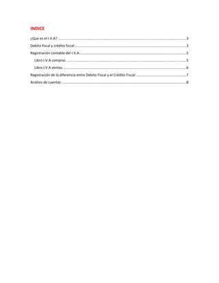 Este documento presenta información sobre el Impuesto al Valor Agregado (IVA) en Argentina. Explica que el IVA grava la venta de bienes y servicios a una tasa del 21% y que las empresas deben llevar libros de IVA para registrar el débito fiscal (IVA cobrado) y el crédito fiscal (IVA pagado). Al final de cada mes, las empresas compensan el débito fiscal con el crédito fiscal y pagan el saldo a la AFIP si el débito es mayor o lo descuentan el mes siguiente si el crédito es mayor. El