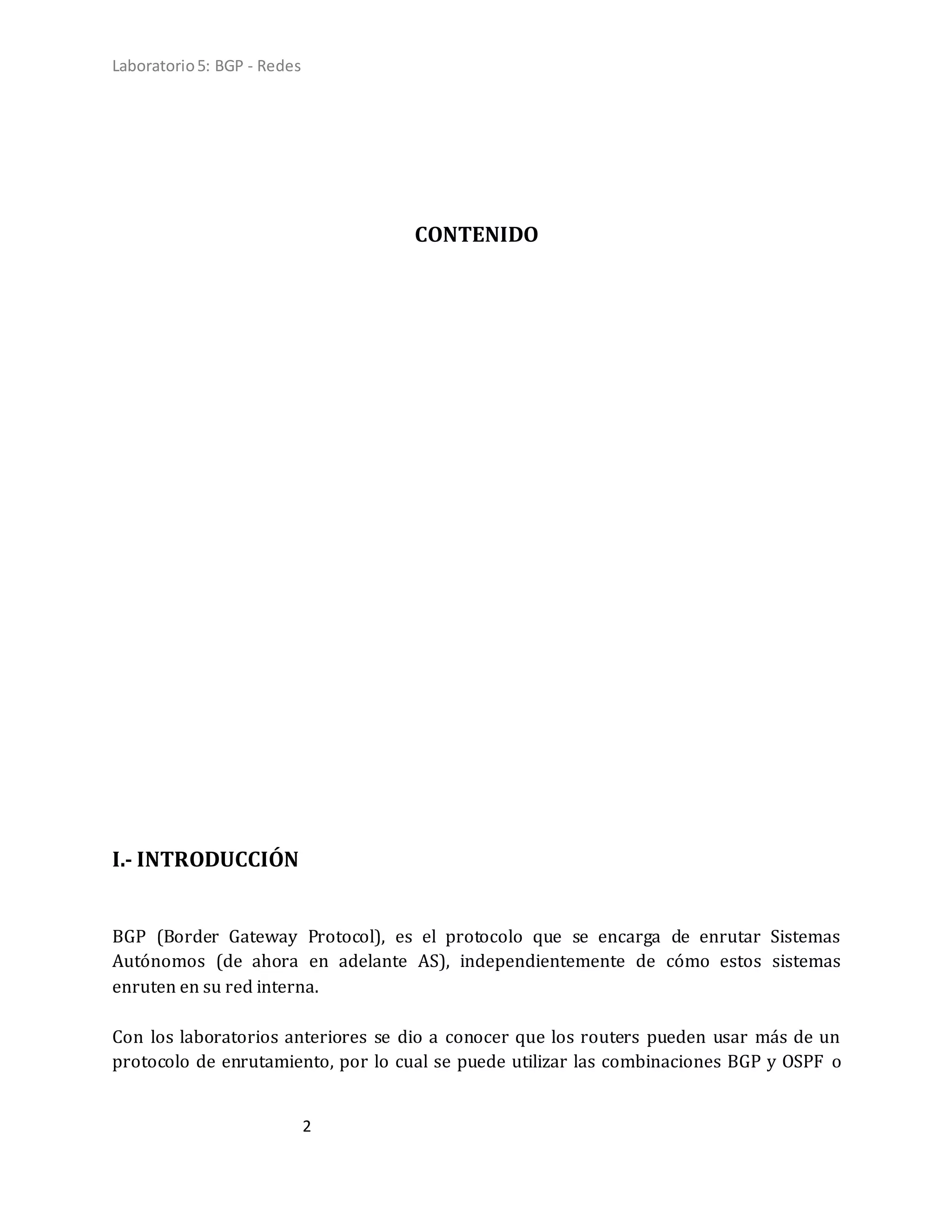 El documento describe la implementación de tres sistemas autónomos (AS) comunicados entre sí utilizando el protocolo BGP. Se configuró cada AS con RIP u OSPF internamente y BGP externamente para comunicarse entre los AS a través de un switch. Se explican los pasos de configuración de BGP en Quagga incluyendo los archivos zebra.conf, ripd.conf y bgpd.conf. Finalmente, se muestra un análisis con Wireshark de los paquetes BGP enviados durante un ping entre dos PCs de diferentes AS.