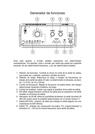 Este informe del laboratorio de circuitos II describe los equipos utilizados como el generador de funciones para crear señales como cuadradas y senoidales, el osciloscopio para visualizar señales eléctricas, y mediciones de resistencias y circuitos serie y paralelo usando un multímetro. Explica las partes y controles de cada equipo y presenta datos teóricos y experimentales de circuitos.