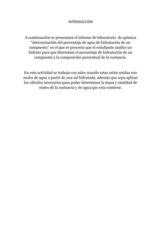 El documento presenta un informe de laboratorio sobre la determinación del porcentaje de agua de hidratación en el sulfato de cobre penta-hidratado. Se midió el peso inicial del compuesto y después de calentarlo para evaporar el agua, y se calcularon las masas de agua y compuesto para encontrar que el compuesto contenía un 36,046% de agua. El experimento estudiantil determinó un 357,14% de agua, con un error del 0,8990% respecto al valor técnico.
