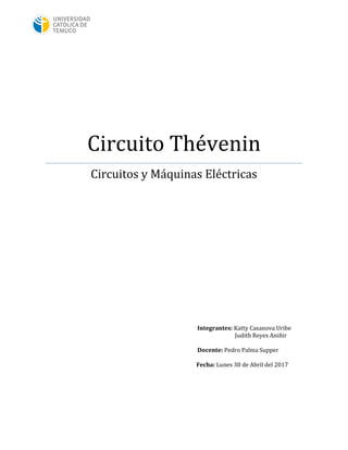 El documento describe cómo aplicar el teorema de Thévenin para simplificar un circuito eléctrico complejo en un circuito equivalente más simple. Explica cómo calcular la tensión de Thévenin (Vth) y la resistencia de Thévenin (Rth) mediante el análisis de un circuito de ejemplo. Los resultados teóricos y experimentales del circuito muestran un error menor al 3,45%, validando la aplicación correcta del teorema.