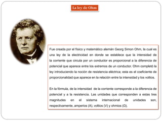 Este documento resume la Ley de Ohm, que establece que la intensidad de corriente es proporcional a la diferencia de potencial en un conductor. Fue creada por Georg Ohm y relaciona la intensidad (I), la diferencia de potencial (V) y la resistencia (R) a través de la fórmula V=IR. La ley es importante para resolver problemas eléctricos y calcular potencia y energía eléctrica. También proporciona ejemplos de cálculos utilizando la ley.