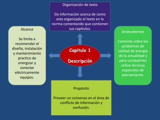 Este documento resume los principales puntos cubiertos en 9 capítulos de la norma IEEE 1100. El capítulo 1 introduce el alcance, antecedentes y propósito de la norma. Los capítulos 2 y 6 definen términos técnicos y describen cómo realizar estudios e análisis eléctricos de sitios. Los capítulos 7 y 8 se enfocan en la especificación, selección e instalación de equipos y sistemas de energía, así como consideraciones de diseño y seguridad. Finalmente, el capítulo 9 cubre