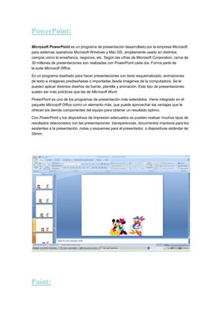 El documento resume brevemente las características y funcionalidades de varias herramientas de productividad y creación de contenido digital como Microsoft Word, PowerPoint, Paint, Tagxedo, Goanimate, Glogster, SlideShare, Pixton, y Blogger.