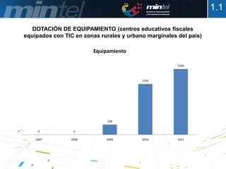 Este documento presenta información sobre el desarrollo de las tecnologías de la información y comunicación en Ecuador entre 2007 y 2011. Durante este periodo, se incrementó la dotación de equipamiento y conectividad en centros educativos, así como el número de usuarios de internet, telefonía fija y móvil. Adicionalmente, se implementaron diversos proyectos como infocentros, alistamiento digital y el proyecto CDMA 450 para expandir la cobertura a zonas rurales.