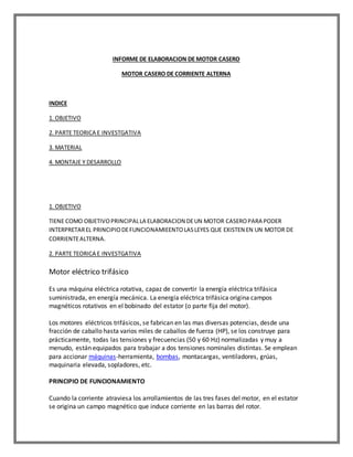 Este documento describe la elaboración de un motor casero de corriente alterna. Explica el objetivo de interpretar el funcionamiento y las leyes de un motor de CA. Detalla los componentes teóricos como el rotor, estator y bobinas, y los materiales utilizados como una lata de leche, alambre y bobinas. Finalmente, resume el montaje y funcionamiento del motor, verificando experimentalmente la ley de Lenz.