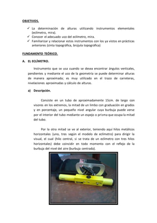 Este documento presenta información sobre el uso del eclímetro y la mira para medir ángulos verticales, determinar alturas y cotas. Explica cómo funcionan estos instrumentos, cómo comprobarlos y calibrarlos, y los pasos para medir ángulos, alturas y distancias horizontales y verticales. Luego describe una práctica de campo para medir los lados, ángulos y cotas de un triángulo usando una cinta topográfica, brújula y eclímetro.
