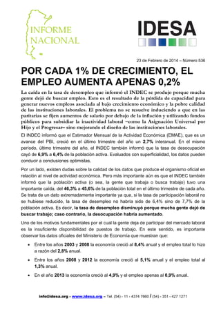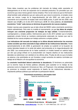 El documento analiza los datos recientes del mercado laboral en Argentina. Señala que la tasa de desempleo disminuyó principalmente porque muchas personas dejaron de buscar trabajo debido a la falta de puestos disponibles como resultado del bajo crecimiento económico. Además, muestra que la relación entre el crecimiento del PBI y la creación de empleo ha ido disminuyendo, generando cada vez menos puestos de trabajo por cada punto de crecimiento de la economía. Esto se debe a la mala calidad de las instituciones laborales del país