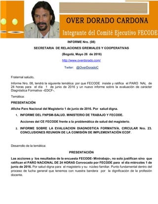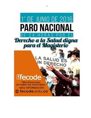 Este informe resume las razones por las que FECODE insiste en realizar un paro nacional de 24 horas el 1 de junio de 2016. Primero, una encuesta realizada por FECODE y el Ministerio de Trabajo mostró deficiencias en los servicios de salud para los maestros y sus familias. Segundo, reuniones entre FECODE, el Ministerio de Trabajo y los contratistas de salud no han logrado mejorar adecuadamente la prestación del servicio. Tercero, la evaluación diagnóstica formativa continúa siendo implementada, a pesar de las