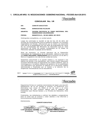 Este informe resume las negociaciones del 20 de abril de 2015 entre el gobierno nacional y FECODE, el sindicato de maestros, sobre el paro nacional indefinido del 22 de abril. El gobierno propuso discutir un mecanismo para aumentar los salarios de los maestros en un 10-28.3% dependiendo de la situación fiscal, mientras que FECODE exigió que se respeten los derechos laborales de los maestros y se fije el presupuesto de educación de acuerdo a sus demandas. FECODE decidió continuar el paro n