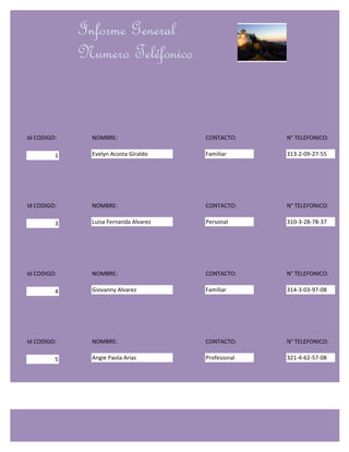 Este documento presenta un informe general de números de teléfono de 35 contactos diferentes identificados por su nombre, tipo de contacto (familiar, personal o profesional) y número telefónico. La información se presenta en una tabla con las columnas Código de identificación, Nombre, Contacto y Número telefónico.