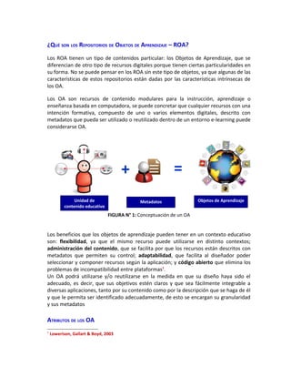 Este documento describe los repositorios de objetos de aprendizaje (ROA) y los objetos de aprendizaje (OA). Los ROA almacenan OA, que son recursos educativos modulares diseñados para ser reutilizados en entornos de aprendizaje en línea. Los OA deben ser reutilizables, accesibles, interoperables y portables para funcionar bien en los ROA. Los metadatos, que describen los OA de acuerdo con el estándar LOM, son fundamentales para la recuperación y reutilización de los O