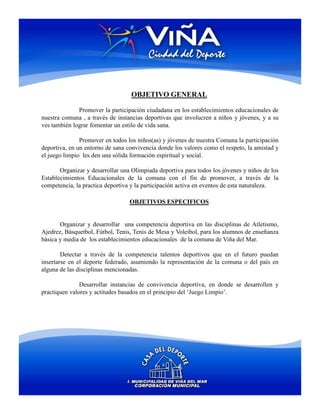 El documento describe un informe sobre la organización de una Olimpiada Escolar en la comuna de Viña del Mar. El objetivo es promover la participación deportiva de niños y jóvenes a través de diferentes disciplinas como fútbol, voleibol, ajedrez y atletismo. Se detallan los objetivos, cronograma, participantes, recintos y resultados de la competencia.