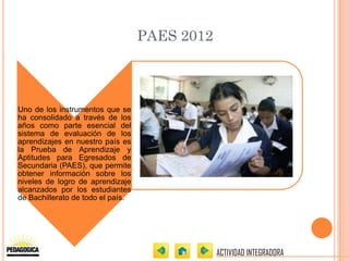El documento presenta información sobre los resultados de la Prueba de Aprendizaje y Aptitudes para Egresados de Secundaria (PAES) de 2012 en El Salvador. Incluye tablas y gráficos que comparan las notas obtenidas en diferentes asignaturas y sectores educativos, así como entre los años 2011 y 2012. El documento también analiza los conocimientos que tienen los docentes sobre los documentos relacionados con los resultados de la PAES.
