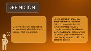 El documento describe la estructura y características del informe periodístico como un género informativo que amplía la noticia con detalles y testimonios sin incluir opiniones del autor. Se enfatiza la claridad y sencillez en la redacción, evitando tecnicismos y adoptando una narración lineal. Además, se presentan directrices sobre la producción de informes audiovisuales y su evaluación en un contexto práctico.