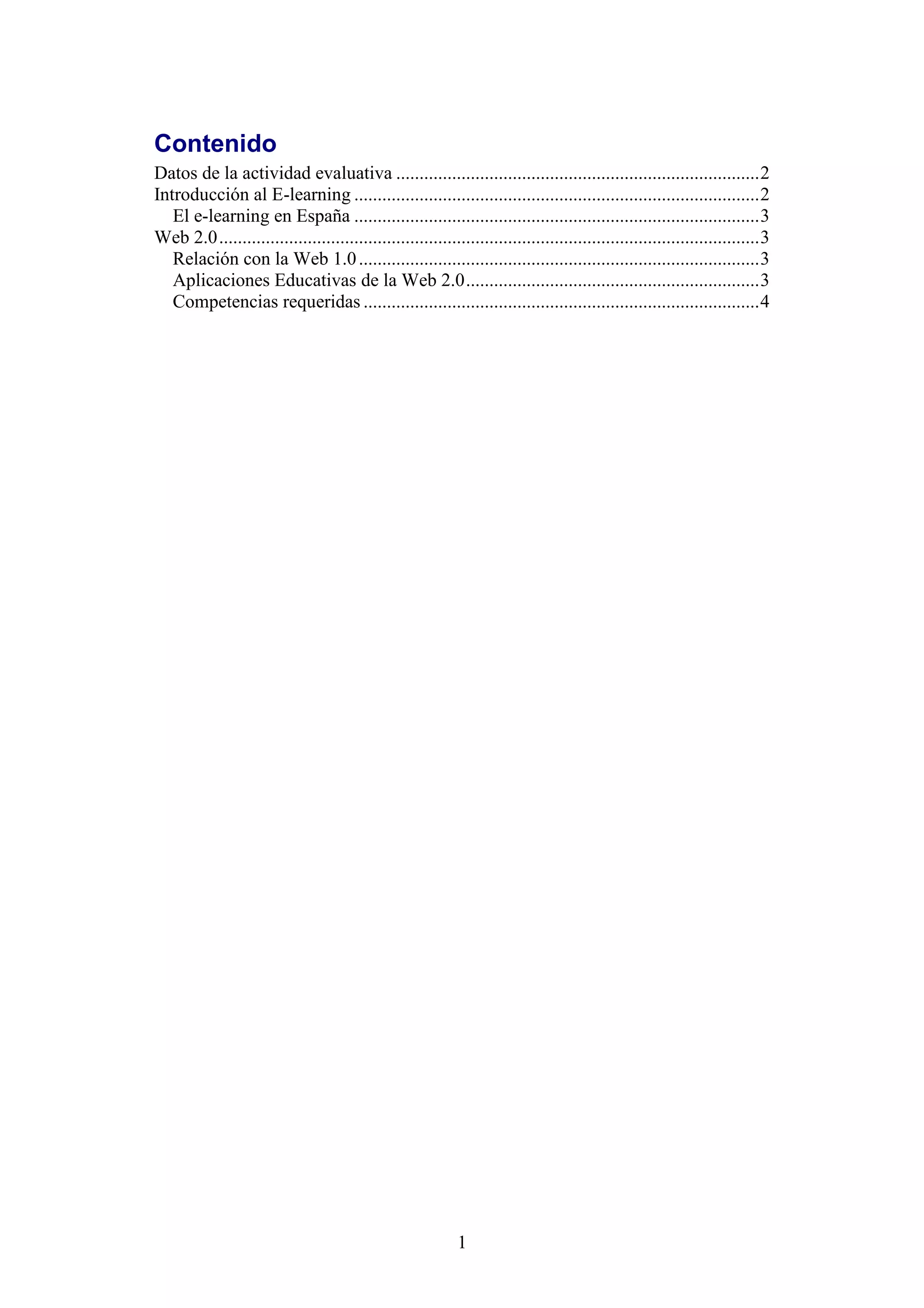 El documento presenta una introducción al e-learning, destacando que utiliza herramientas digitales como Internet para la formación a distancia. También describe las ventajas del e-learning y su crecimiento en España. Explica el concepto de Web 2.0 y sus aplicaciones educativas, permitiendo la interacción y colaboración entre usuarios. Finalmente, señala las competencias digitales y sociales necesarias para los estudiantes y profesores para aprovechar estos recursos educativos.