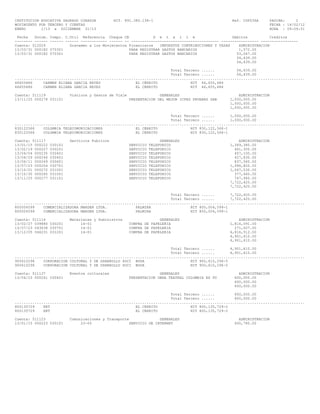 Este documento presenta los movimientos financieros de la Institución Educativa Sagrado Corazón entre enero y diciembre de 2013. Se detallan los gastos realizados en equipos de enseñanza, estudios y proyectos, materiales y suministros, servicios públicos, eventos culturales, entre otros. Asimismo, se especifican los proveedores a los que se les realizaron los pagos correspondientes a cada concepto.