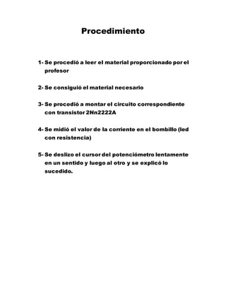 Este informe describe una práctica en la que se montó un circuito con un transistor bipolar 2N2222A para regular la corriente que pasa a través de un LED y una resistencia al deslizar un potenciómetro. Se midió el valor de la corriente y se explicó cómo al mover el potenciómetro, la corriente aumenta o disminuye, demostrando que el transistor puede usarse como regulador de corriente.