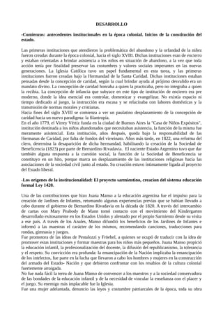 El documento describe la evolución del nivel inicial en Argentina desde sus orígenes en el siglo XVIII hasta principios del siglo XX. Comenzó con instituciones religiosas asistencialistas para niños abandonados, luego surgió un enfoque filantrópico. Sarmiento y Juana Manso promovieron los jardines de infantes basados en métodos pedagógicos modernos. La Ley 1420 de 1884 estableció la creación de jardines de infantes, aunque inicialmente fueron accesibles solo para las clases altas. A principios del siglo XX,