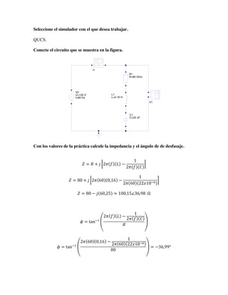 Este documento presenta los resultados de un laboratorio sobre circuitos RLC en serie y paralelo. Se calculan teóricamente las impedancias y ángulos de desfasaje, y se comparan con los valores medidos experimentalmente. Los resultados teóricos y experimentales coinciden dentro de un margen de error pequeño, validando la teoría. Adicionalmente, se observa que los valores se reducen para el circuito en paralelo en comparación con el circuito en serie.