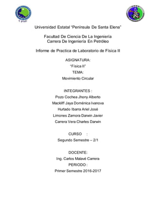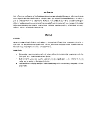 Este documento presenta el informe de un laboratorio sobre movimiento circular realizado por estudiantes de ingeniería petrolera. El objetivo era determinar experimentalmente procesos y cambios que influyen en el movimiento circular mediante el uso de herramientas de laboratorio. Los estudiantes midieron velocidad angular, aceleración centrípeta, fuerza centrípeta y periodo para varios objetos en rotación. Los cálculos confirmaron las relaciones teóricas entre estas cantidades y permitieron comprender mejor los principios del movimiento circular.