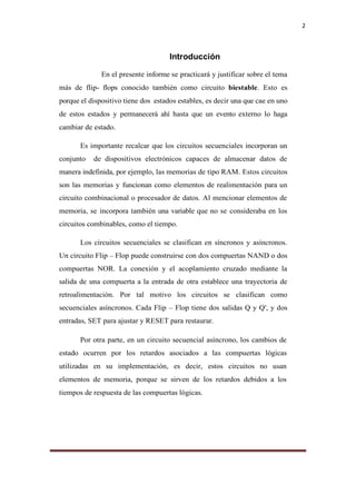 Este informe describe el funcionamiento de los flip-flops. Los flip-flops son dispositivos de almacenamiento binario que tienen dos estados estables y son utilizados para construir circuitos secuenciales. Se clasifican los flip-flops en síncronos y asíncronos. Se estudian los flip-flops J-K, SR, D y T, incluyendo sus tablas de verdad, diagramas de tiempo y símbolos. Finalmente, se realizan prácticas utilizando flip-flops para funciones como divisores de frecuencia y contadores.
