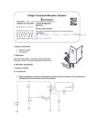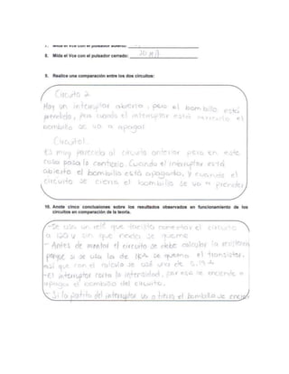 Este documento describe dos circuitos eléctricos que utilizan un pulsador y un transistor para encender y apagar una bombilla. El primer circuito enciende la bombilla cuando se presiona el pulsador, mientras que el segundo la apaga; también explica que un relé puede controlar circuitos de mayor potencia y que aunque el comportamiento del pulsador varía, el transistor cumple la misma función en ambos circuitos.