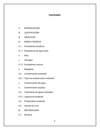 Este documento presenta un resumen del informe de práctica de campo realizado por estudiantes de Licenciatura en Ciencias Naturales y Educación Ambiental en diferentes municipios del departamento de Córdoba. El informe identifica y describe problemas ambientales encontrados en sitios como Montería, Cereté, Lorica, Ciénaga de Oro y San Antero. Además, analiza los ecosistemas acuáticos de la región como ríos, ciénagas y manglares, así como problemas relacionados con la contaminación y el tratamiento de aguas residual